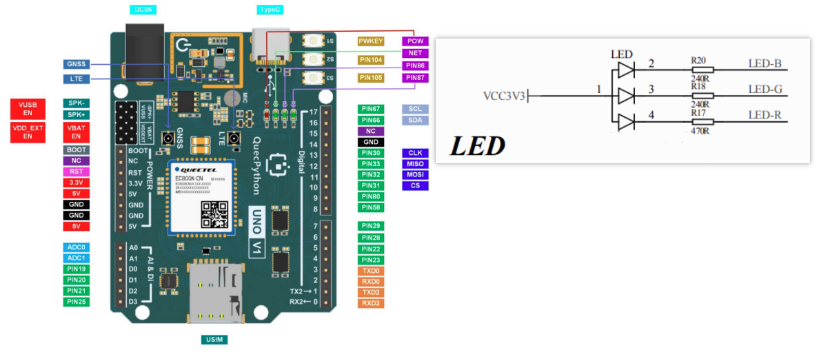 下图介绍了EC800X QuecDuino 开发板主要管脚布局,以及硬件外设原理图。