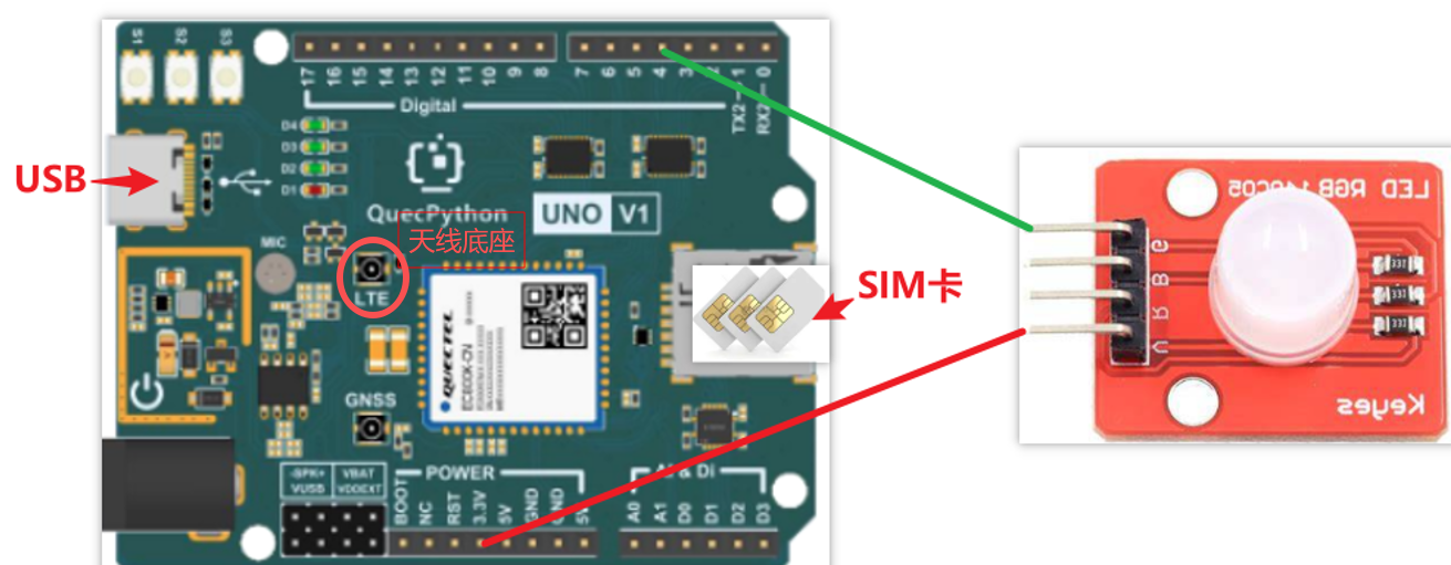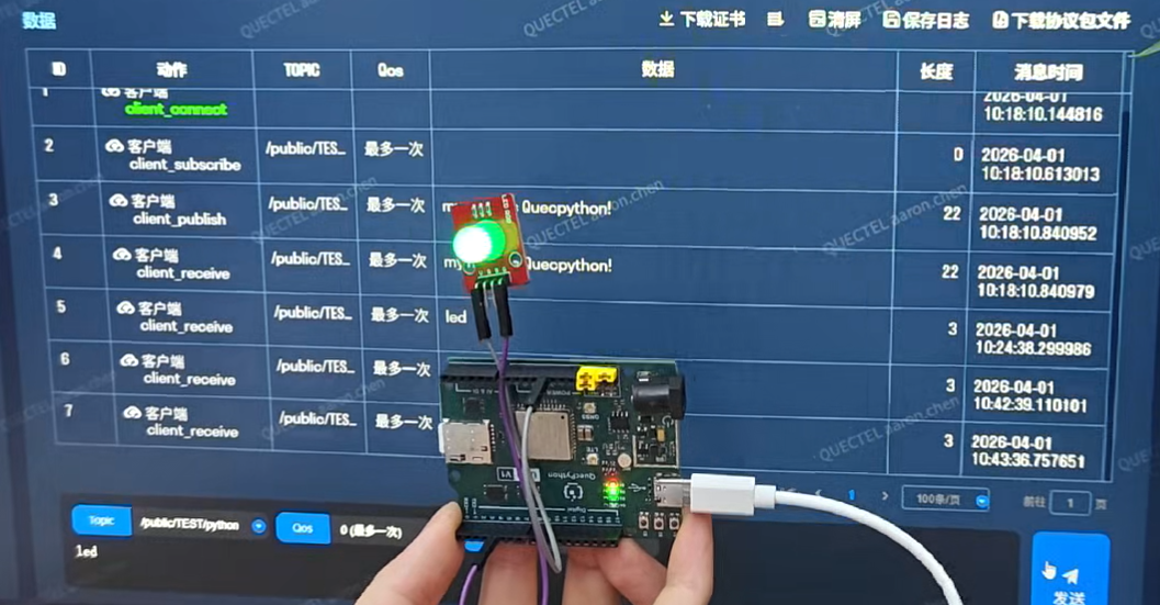完成 EC800X Duino 开发板网络配置与 MQTT 参数设置后,可实现MQTTS 加密通信 + 云端指令解析 + GPIO 电平控制,完整实现物联网 “云端下发指令→设备执行动作” 的标准流程;无需复杂的外围设备,极简硬件搭配即可完成物联网通信落地。